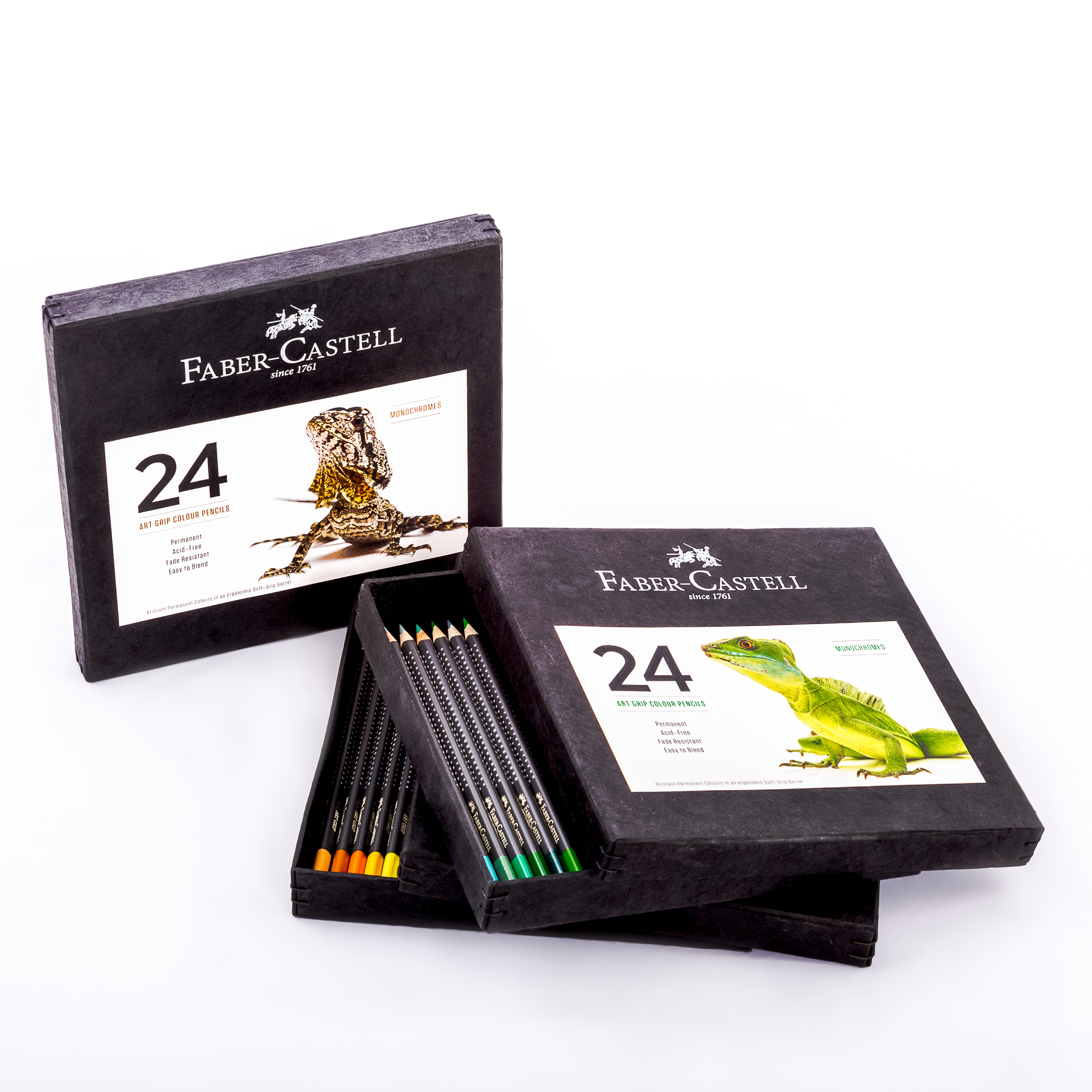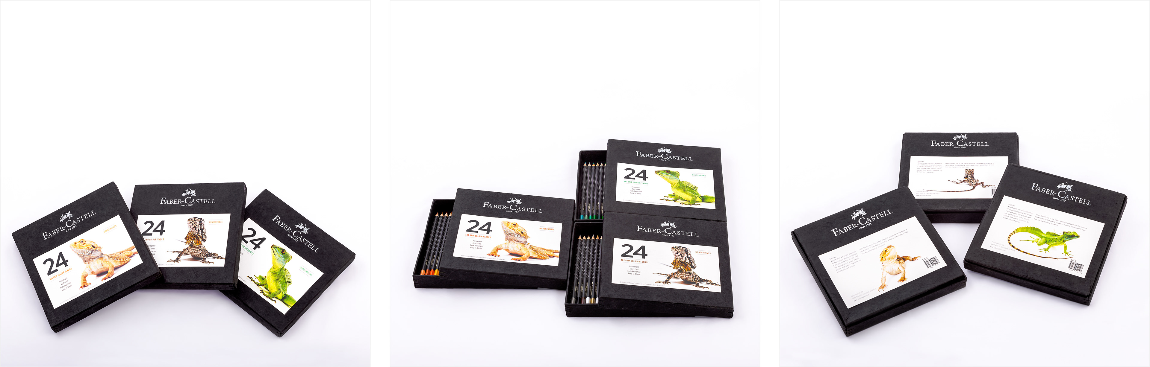 After evaluating the current Faber–Castell packaging structure, I did not feel that the quality of the product was well represented by the simple tins that they packaged their exceptional pencils in. It may have been that at some point that there were not as many companies that chose to use the tins and so they stood out, but that is definitely no longer the case. From my research, tins are now quite common for colour pencil packaging. I also noticed that Faber–Castell had some well made packaging structures for their pencils that were sold in larger quantities. For this project I wanted to bring out the brands regality found in the larger pencil sets to the smaller sets, a well designed Eco–friendly packaging alternative without increasing the cost of the materials. I used boxes made out Loktah paper, a beautiful spin on Eco–friendly packaging with a high–end feel and look. I also wanted to accentuate the fact that it is a well established and trusted brand while updating the look a bit. I used images that accentuated the colours that can be found within each package. Rather than using the cliché colour pencil illustrations, I chose to use photographs for my designs to modernize the overall look of the packaging. PROJECT OBJECTIVES Design a new packaging structure for a set of 24 colour pencils to replace the current structure, that incorporates innovative ideas and uses minimal materials.