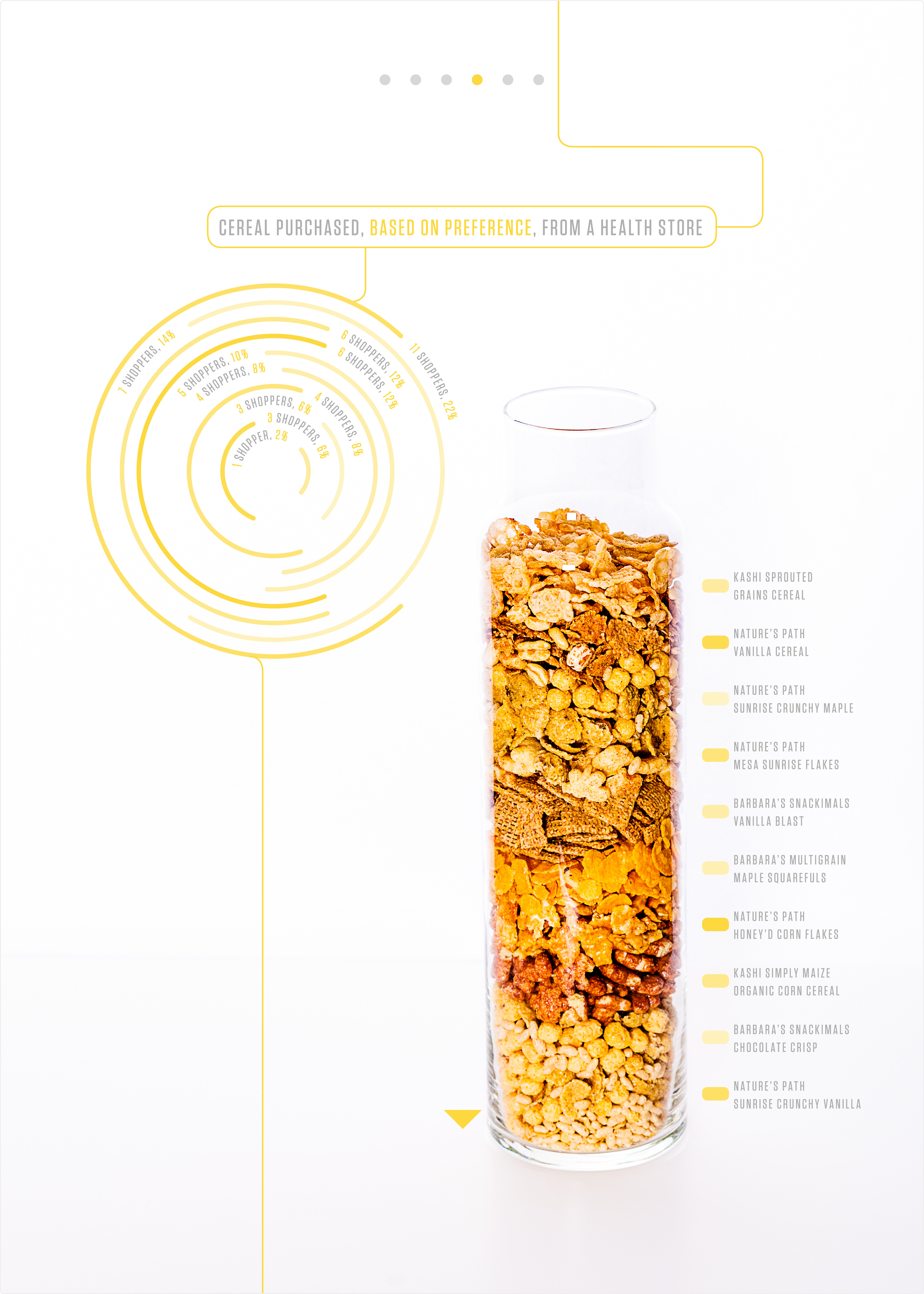 Given the requirement of creating an application using urban archeology as a metaphor, I chose to gather information concerning the choices made by consumers when shopping for cereal at a traditional grocery store versus those at a store marketed as a healthy alternative. Using photography, as a mechanism to visually convey the statistics, I designed an interactive and entertaining app in order to share the information with the public. PROJECT OBJECTIVES Using archeology as a metaphor, explore the artifacts of your urban surroundings and create an interactive visual documentation of your findings. For the purposes of this project, you will use the term “urban” to apply to any human built environment.